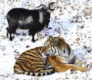 Но вот, однажды, в конце ноября 2015 года Амуру привели на обед одного козла. Этот копытный оказался нетипичным представителем козлиной расы. Он совсем не испугался тигра, который, ни больше, ни меньше, намеревался его съесть. Специалисты оправдываются тем, что козла «просто не научили бояться тигра» и что он совершенно не знал, «для чего его привели к тигру на свидание». Как бы то ни было, копытный дал неслыханный отпор полосатому. Вероятно, он встал на дыбы, выставив при этом свои загнутые рога: «Поберегись, киска, забодаю!» С большей точностью узнать об их первой встрече нам не удасться, так как никто тогда не наблюдал за ними, никто не стоял рядом с решеткой с фото или кинокамерой. Да и для чего? Невеселое это зрелище, смотреть, как тигр убивает и поглощает свою жертву...